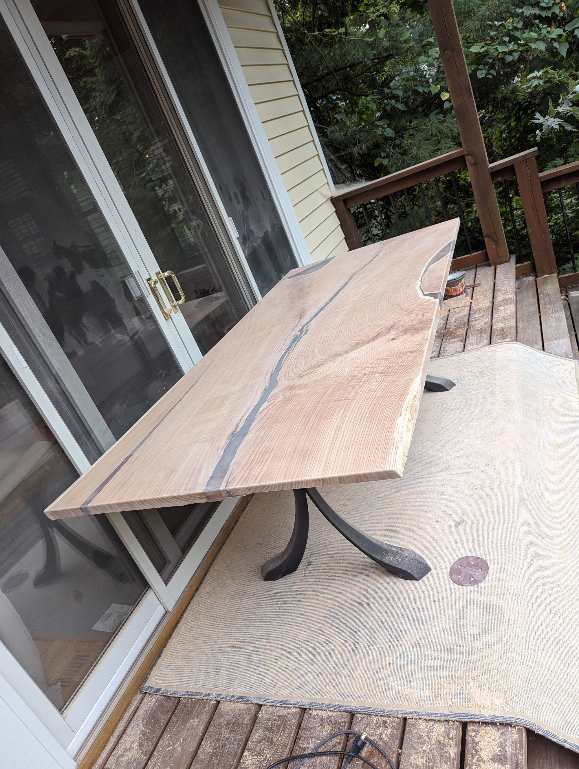 Found some beautiful powder-coated metal legs on Etsy by Flowy Line Design, and built an oak center stretcher that ties it all together structurally. Finally the Top had a base coat of epoxy and then several coats of clear polyurethane, before we gave it a boardgame trial on the back deck (highly recommend the game Pandemic Legacy btw!)